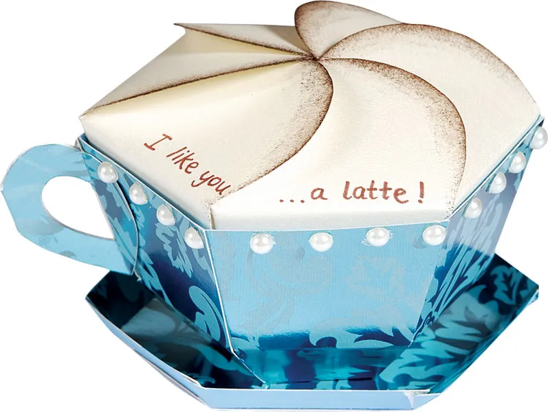 Use a sheet of Champagne Pearl from the Metallics cardstock for the tea (or coffee) top. Once the topper is assembled, unhook the panels and ink the edges of them with a makeup wedge and Timber Brown StazOn®. Reassemble the panels. Write “I like you a latte” on the edge of the topper as shown.