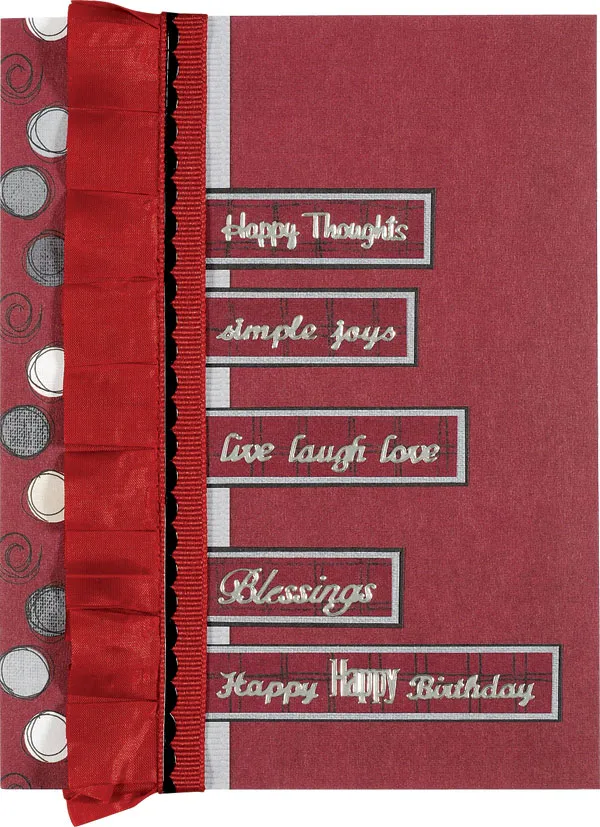 Place the Dazzles™ phrases shown here on burgundy plaid paper and trim the phrases to ½" wide. Mat each on gray textured paper with 1/16" borders, then on black paper with 1/32" borders. Glue to the front, tucking the left mat edges under the burgundy ribbon as shown.
