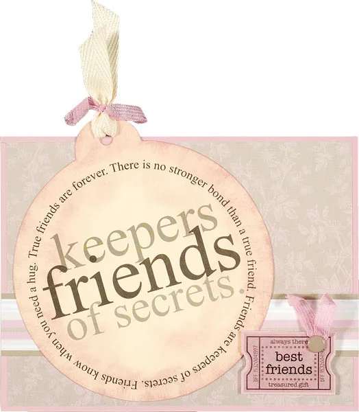 Cut out the “best friends” overlay ticket and glue to pink cardstock. Cut a 1/32" mat around the edges. Insert a taupe brad at the upper right and wrap 3" pink fiber around the brad prongs. Foam tape the ticket to the front at the lower right.