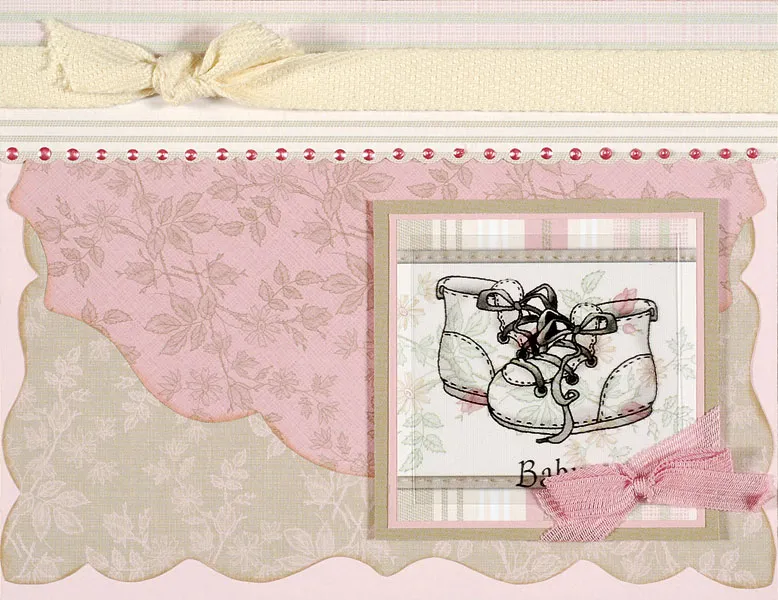 Cut 2½"x2½" floral border paper and mat on pink cardstock with 1/16" borders. Mat on tan cardstock with 1/8" borders. Cut the baby shoes overlay to 2¼"x2¼" and glue centered on the border paper. Wrap 3" fiber across the lower right corner, glue the ends to the back, then foam tape the shoes to the front at the lower right. Tie and glue a fiber bow as shown. Dot liquid pearls on the scalloped border and let dry completely before handling the card further.