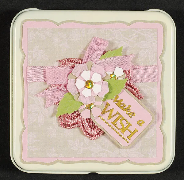 Trace and cut a tag from pink cardstock. Place the Dazzles™ words on it, then mat on tan cardstock with 1/32" borders. Glue and foam tape in place, tucking it under the paper flowers. Place jewel Dazzles™ on the flower centers, then use tape to secure the square centered on the box lid. Tuck the folded card in the box.