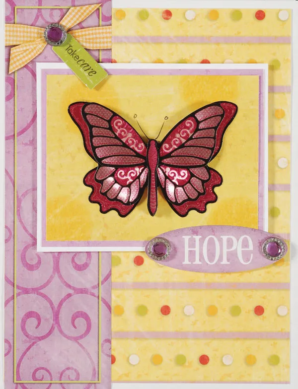 Place the “hope” sticker on the lower right corner of the butterfly focal, adding foam tape under the lower edge. Punch out the small rectangular green tag die cut, trim off the nibs, and stamp “take care” on it. Glue to the printed ribbon, overlapping the butterfly focal edge. Place crystals as shown.