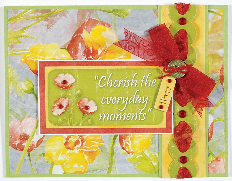 Mat the “cherish the everyday moments” sticker on Pastel yellow cardstock with 1/16" borders, then on Floral red cardstock with 1/8" borders. Mat on white cardstock with 1/32" borders, then foam tape to the front, overlapping the border as shown.