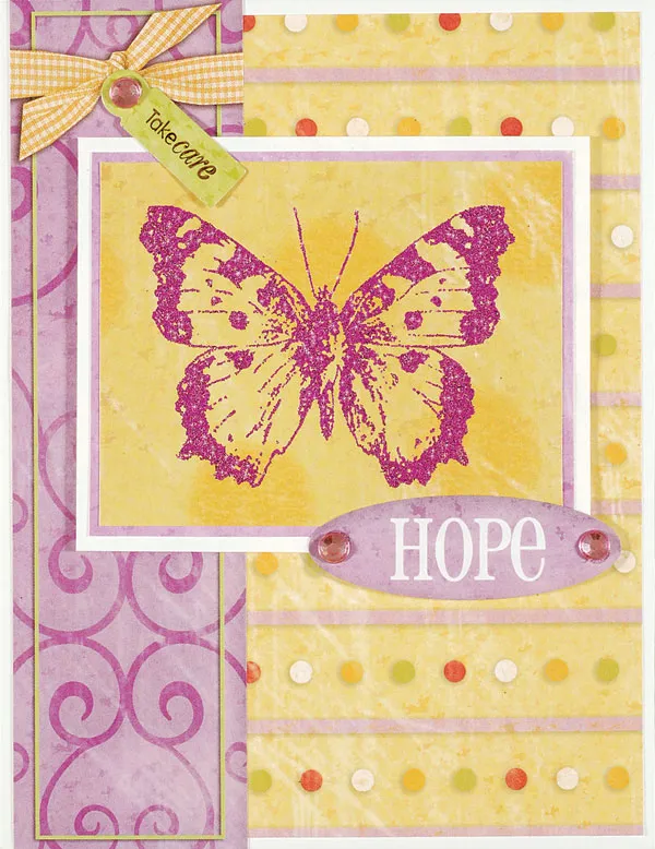 Place the “hope” sticker on the lower right corner of the butterfly focal, adding foam tape under the lower edge. Punch out the small rectangular green tag die cut, trim off the nibs, and stamp “take care” on it. Glue to the printed ribbon, overlapping the butterfly focal edge. Place rhinestones as shown.