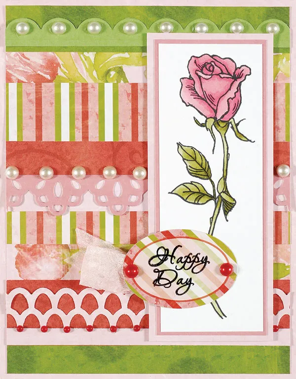 Mat the rose on Pastel pink cardstock with 1/16" borders, then on Floral pink cardstock with 1/8" borders. Foam tape 3/8" from the right edge. Punch out the pink/red oval label, trim off the nibs, and stamp “happy day” with Jet Black ink on it. Fold a 4½" ribbon into a 1½" loop with the tail behind it and glue behind the left end of the label. Glue and foam tape the label and place pearls as shown.