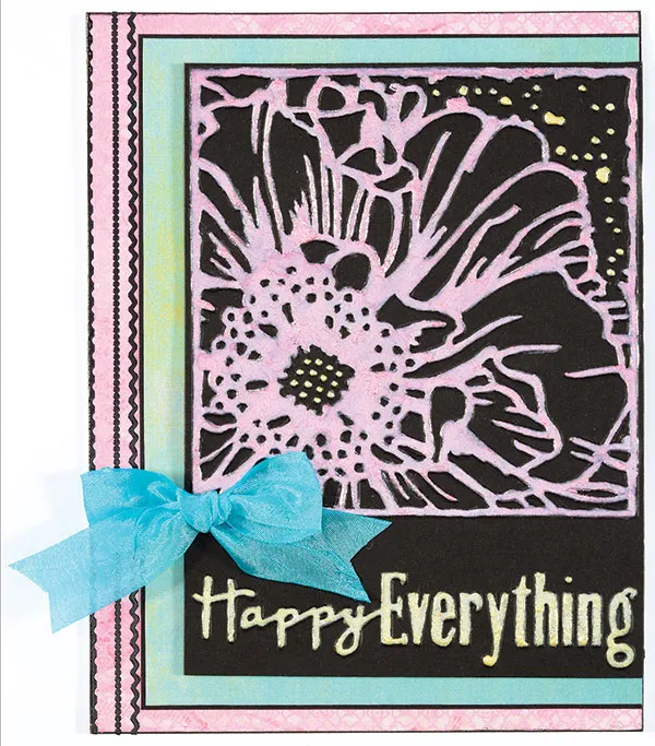 Use the embossing folder and Die-Cutting/Embossing machine to emboss the Framed Floral image on each of 2 pieces of black cardstock. Trim 1 with a 1/16” border. Using the craft sheet or acrylic block as a paint palette, shake the containers of Liquid Metals and squeeze a small amount of each color on the craft sheet. Use the brush to paint the embossed surface of the flower and words with the Liquid Metals as shown. (tip—Be sure to stir the liquid metal colors frequently with your brush while using, to keep the metallic component from settling out.) Let dry. Foam tape on the card. Add Thin Lines Dazzles™ and ribbon.