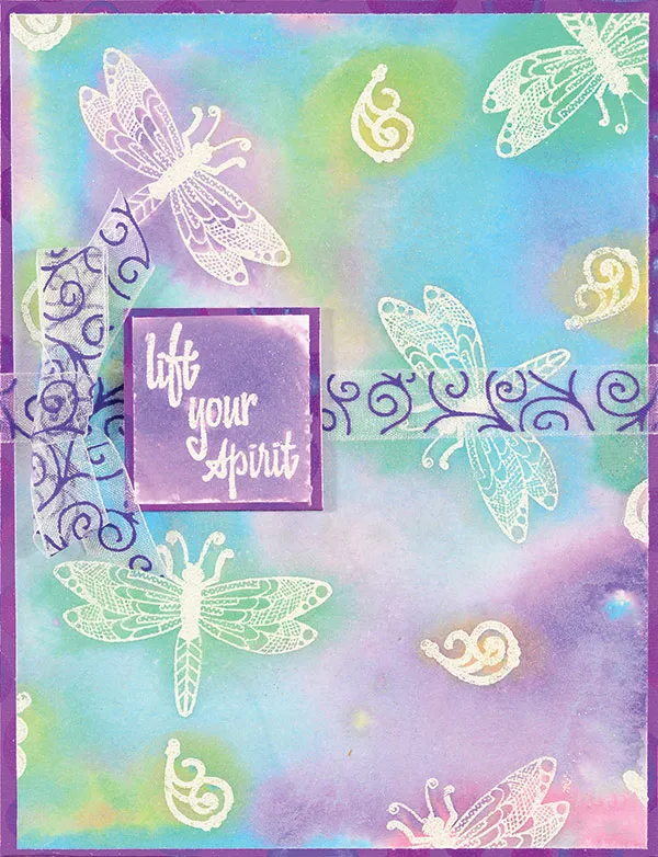 Cut a 4 7/8”x6 3/8” white cardstock. Stamp several dragonflies and swirls in VersaMark™ ink. Dust with white embossing powder. Tap off the excess. Heat with a heat tool. Spritz with water. Drop 1-2 drops of each color of Liquid Metal. (Make sure to shake bottle before each use.) Spritz again with water, and move the card around to distribute the color. Dab extra wet spots with a paper towel. You can increase color in areas by dropping the color, and swirling a bit with a paper towel. Squirt a drop of color on each wing of a dragonfly. Spritz with water, and spread with a paper towel Make each dragonfly a different color. Mat on a 5”x6½” purple circles holographic paper with 1/8” borders. Wrap a ribbon around the middle, and glue to the card front.