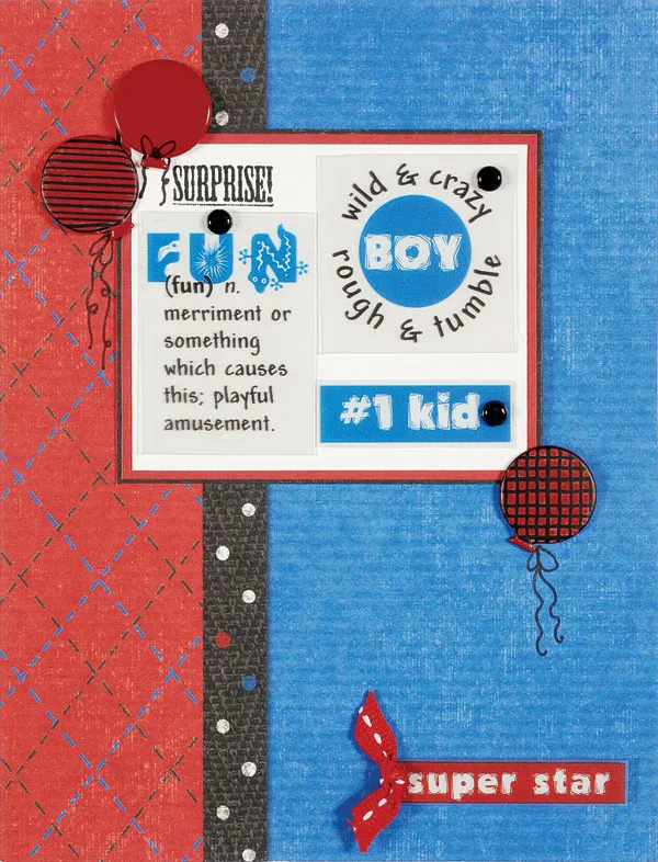 For the card front: Turn the card with the fold at the left. Cut blue/red border paper to cover the front, with the red border on the left and cutting it to 1½" wide. Cut 3"x2½" white cardstock and mat it on red paper with 1/16" borders, then on black paper with 1/32" borders. Cut out the “#1 kid&rdquo,; “fun&rdquo,; and “wild & crazy” vinyl pieces. Glue to the white cardstock and stamp “surprise” as shown.