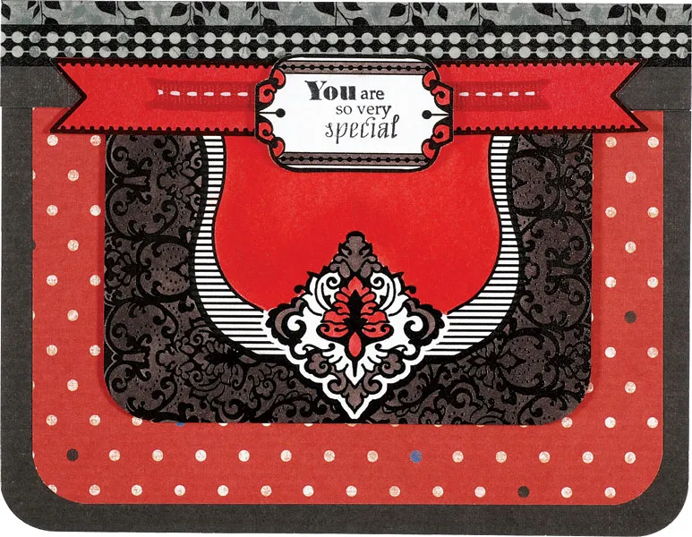 Cut out the 5 5/8" Color Me™ banner and color it red, then glue as shown. Cut a 3¾" red ribbon and trim each end in a “V.” Glue centered on the banner. Cut out the 1 7/8" Color Me™ lace tag and stamp “you are so very special” on it. Color it with CR 10 and BG6 and foam tape as shown.