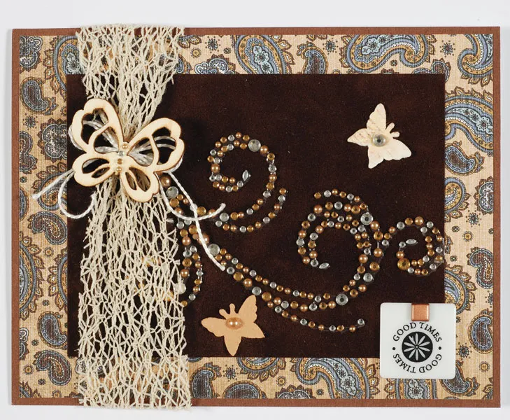 Cut 4¼" from one end of the jewel swirl and place diagonally on the suede paper, beginning at the upper left. Cut a 7" mesh ribbon and wrap thread 3" from one end, then tie a thread bow. See the tip above to cut off two large and a strip of four tiny jewels for the butterflies. Glue the ribbon as shown, gluing the ends to the back. Glue the constructed front to the card.