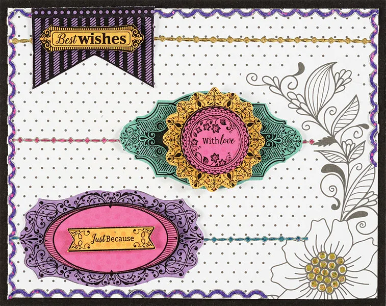 Place the card with the fold on top. Cover with black cardstock. Glue a 6¼”x4¾” Colorist border paper centered, with the border on the bottom right. Place purple jewel Dazzles™ as shown.