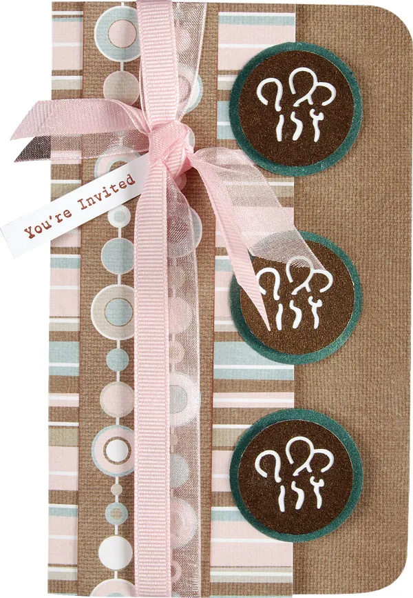 Ink the long edges of the Retro Beads and cut to 6 1/2” long. Glue to the card front. Wrap the card front with both types of ribbon. Knot and trim the tails to 1 1/2” long. Cut a 3/8” wide strip of white cardstock and stamp “You’re invited.” Glue under the ribbon knot.