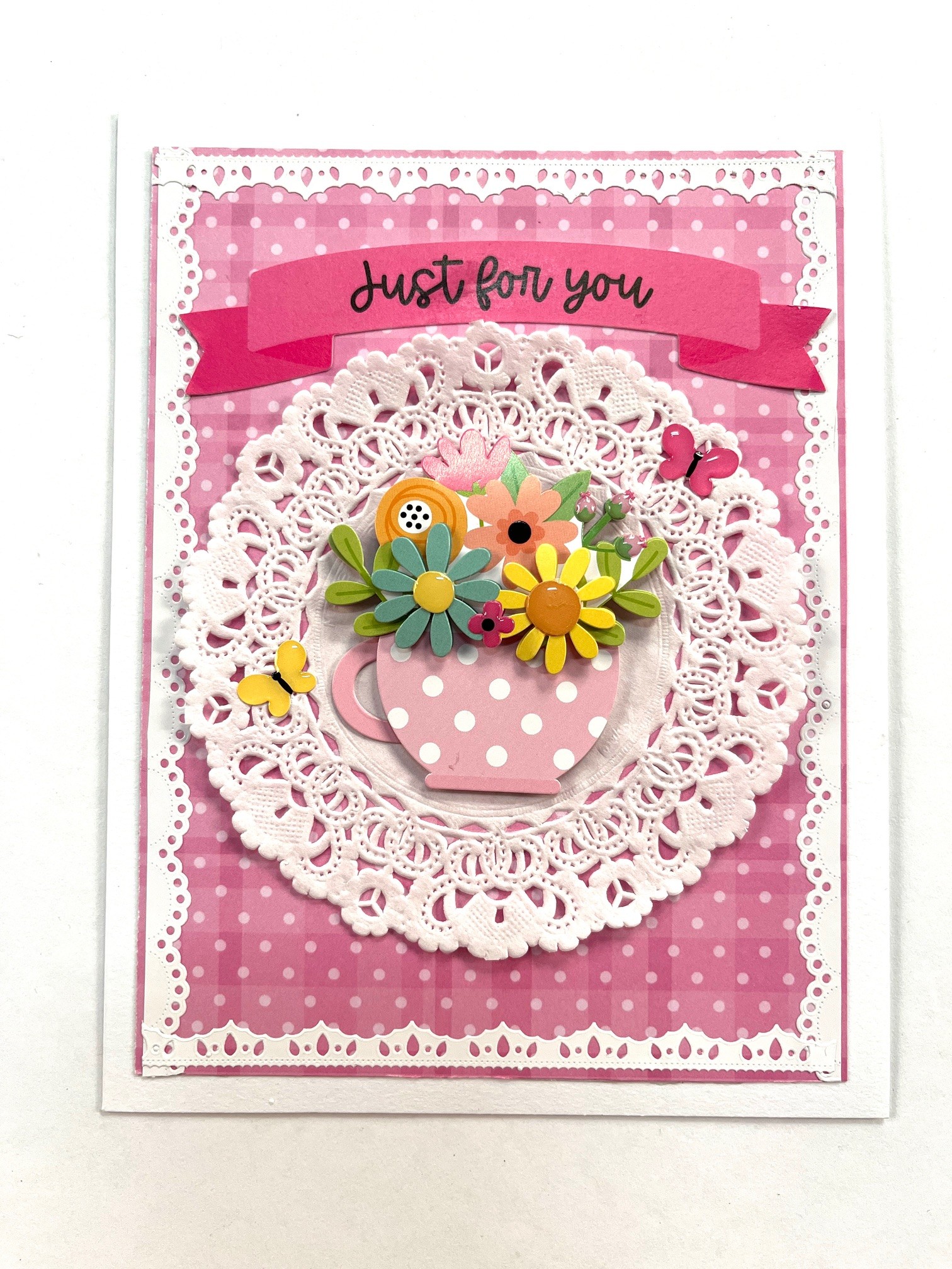 2. Glue “Just for you” banner at the top. Glue the center of a paper doily just below the banner. Place the Cup of Cheer sticker in the center. Place two Butterfly Kisses butterflies as shown.