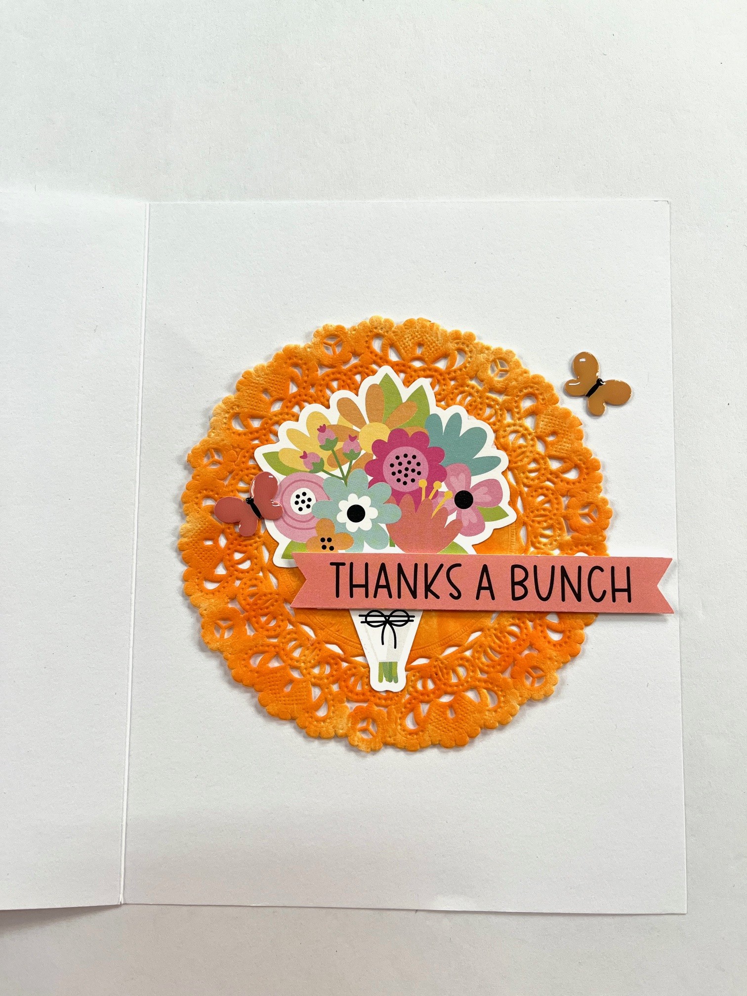 3. Inside: Place another doily on the craft mat. Use a blender brush to apply tangerine ink pad over the doily. Glue in place. Glue flower bouquet die-cut in the center. Foam tape “Thanks a bunch” as shown. Place two Butterfly Kisses butterflies as shown.