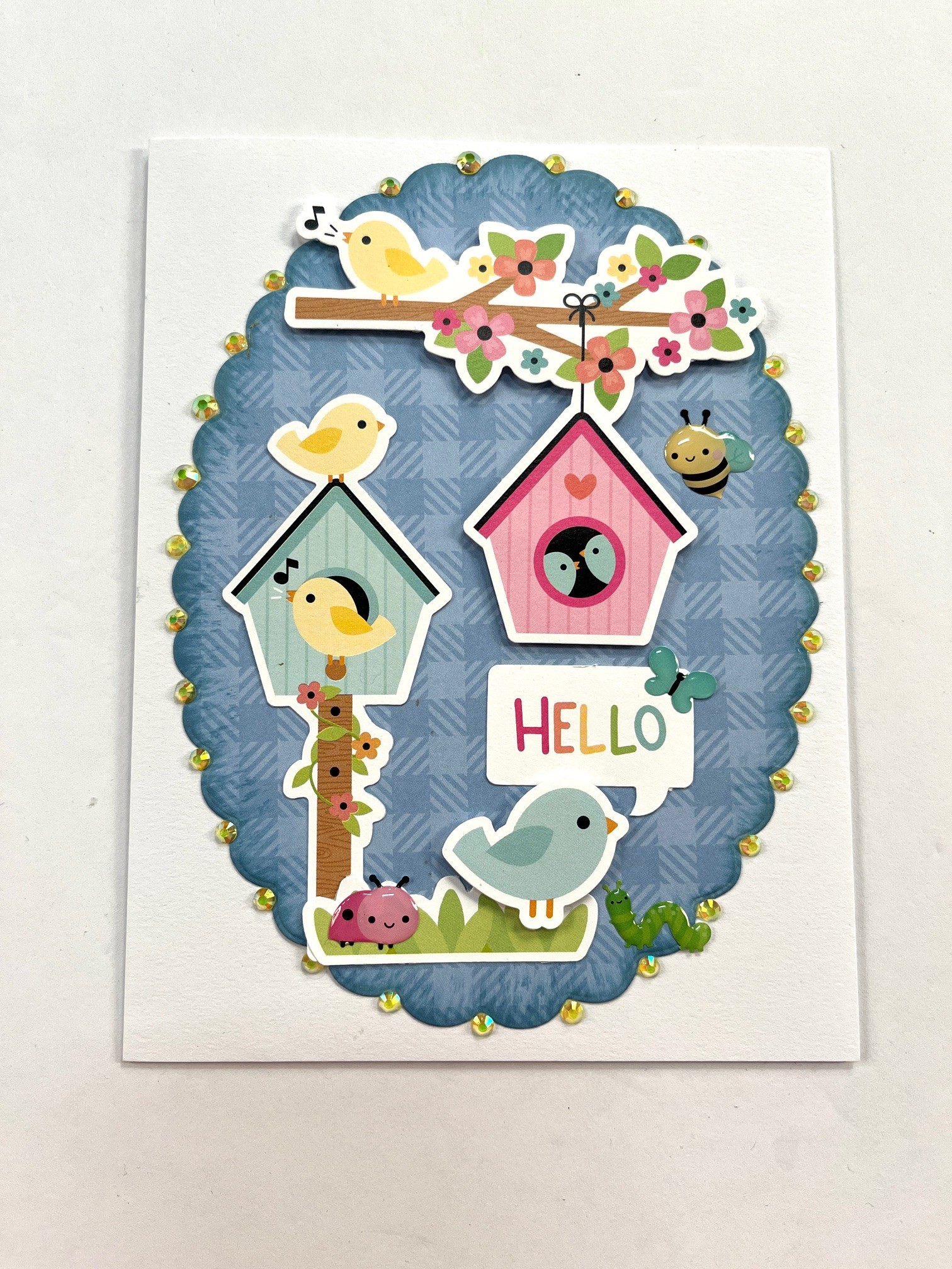 2. From the die-cuts glue the standing birdhouse, grass and “hello” as shown. Foam tape the bluebird and branch with hanging birdhouse also as shown. Place a butterfly, bee, green worm and ladybug as shown.