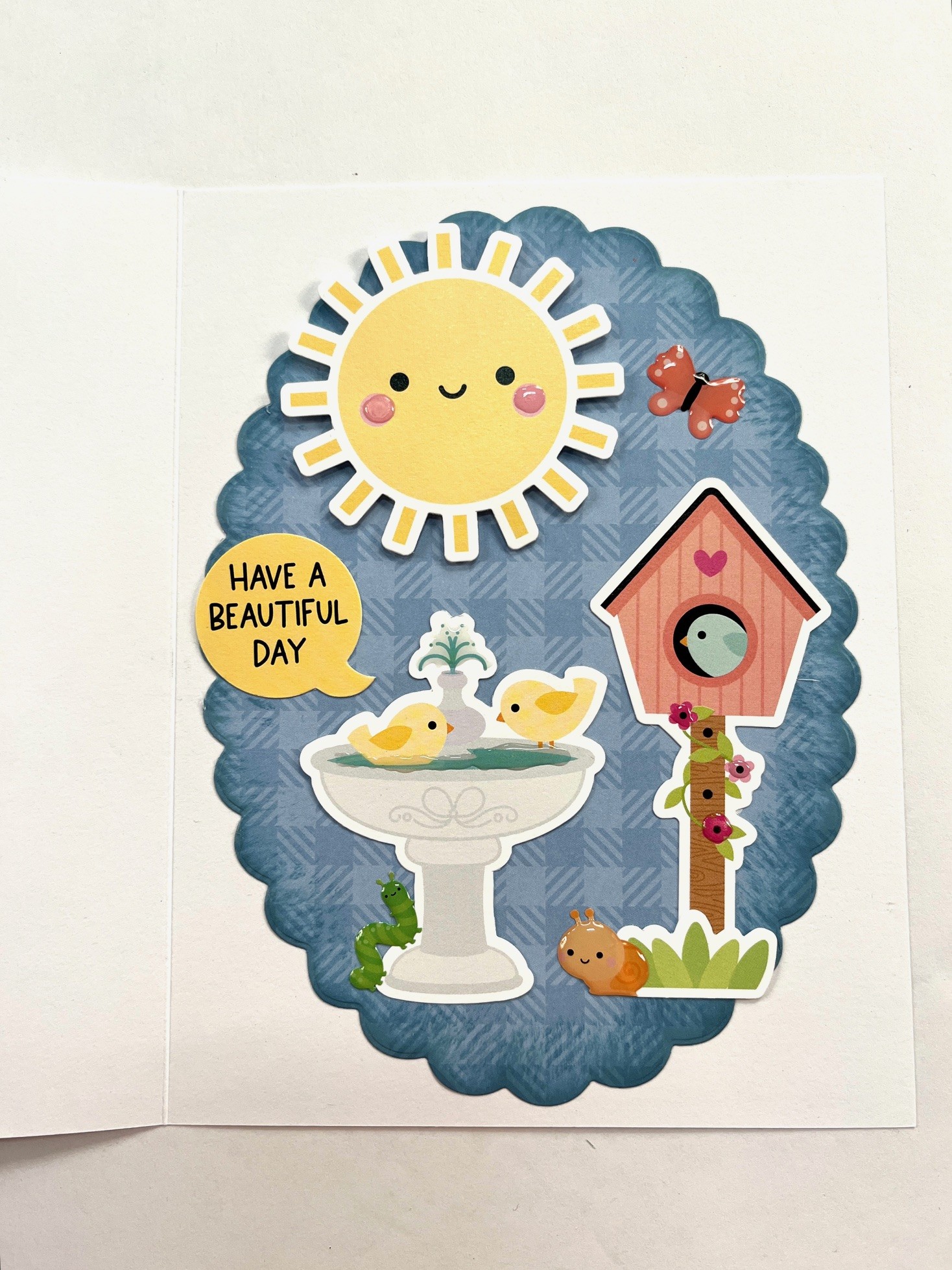 4. Inside: Repeat to cut and color another blue piece. Glue the standing birdhouse, grass, fountain and “Have a beautiful day” die-cuts as shown. Foam tape the sun in place. Position a butterfly, worm and snail as shown.
