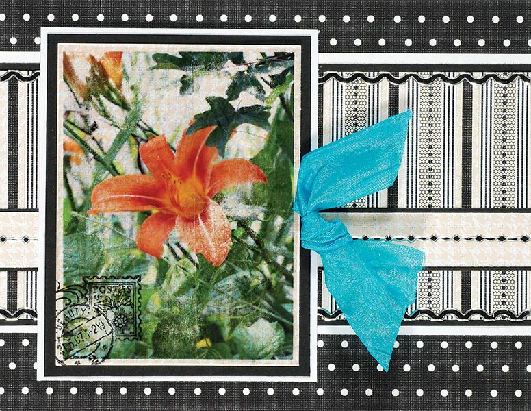 Mat your photo piece on White Truffle cream texture paper with a 1/16” border. Stamp the postmarks in black on the bottom left corner. Mat on black cardstock with a 1/8” border then on white with a 1/16” border. Glue ½” from the left side of your card. Glue a knot of ribbon as shown, with ends cut at an angle.