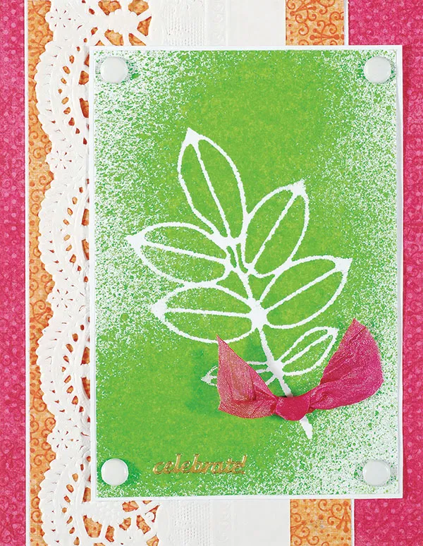 Mat on white cardstock with a 1/16” border and add large white brads to each corner. Glue ¼” from the right edge of your card and place “celebrate” Dazzles™ as shown. Glue a knot of ribbon onto the stenciled leaf.