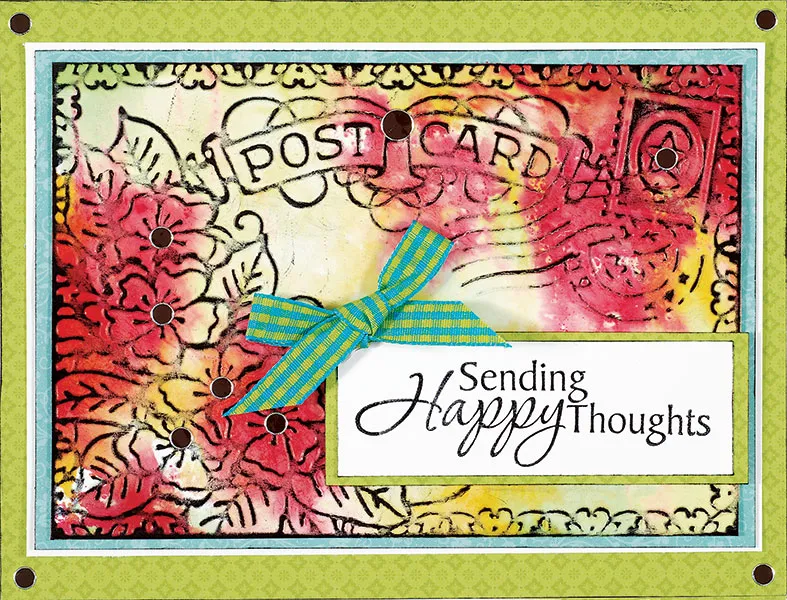 Stamp “Sending Happy Thoughts” on a 3¼”x1” Silky Paper and ink the edges. Mat on Pretty Little Posies green tile paper with a 1/16" border, ink the edges and foam tape ½” from the bottom edge on the focal, as shown.