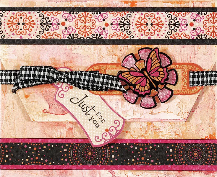 Stamp “Just For You” on a tag die-cut and thread onto a length of ribbon. Thread the orange label die-cut onto the right side of the ribbon, then wrap the ribbon around the pocket and tie a bow on the left. Foam tape the flower and butterfly die-cuts onto the label.