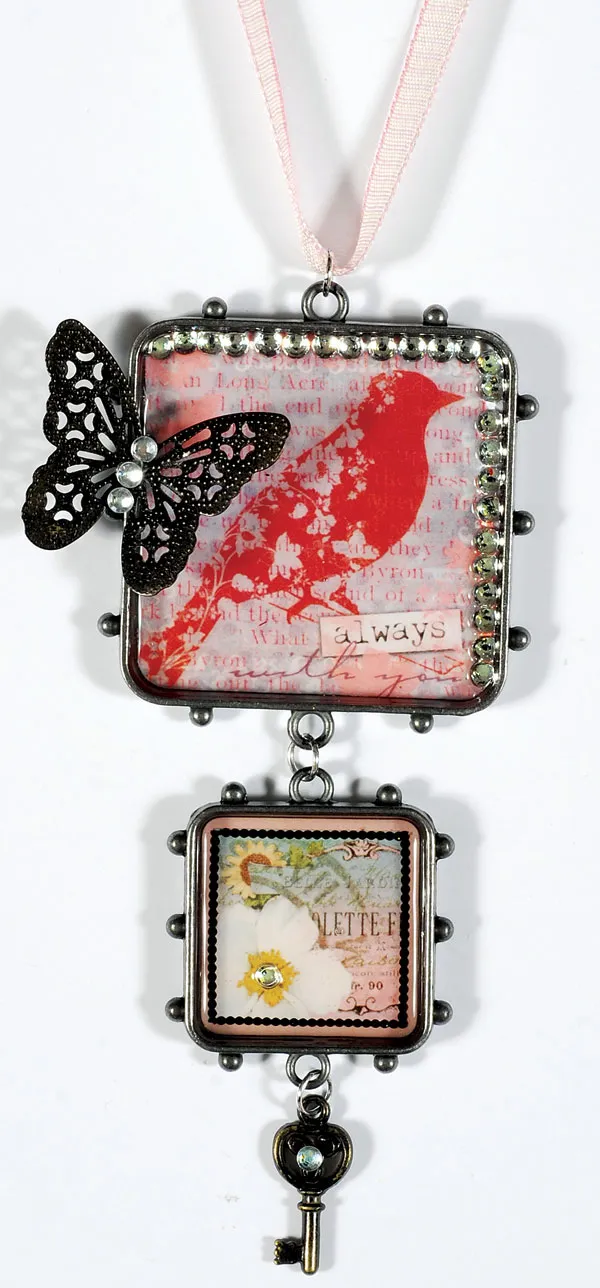 Ink 3 jump rings, 1 antique filigree butterfly, and 1 antique key with StazOn® Jet Black ink. Let dry. Add 3 silver crystals to the body of the butterfly and glue or Zot™ it to the left side of the large square bezel. Add a crystal centered on the heart portion of the key. Add a jump ring to the top and bottom loops of the large square bezel. Add the medium square bezel to the bottom of the large bezel, connecting them with the jump ring. Place a third jump ring on the bottom of the medium square bezel and add the key to the jump ring. Thread 1/4" wide Nona’s Garden pink gingham ribbon through the jump ring at the top of the large bezel for wearing.