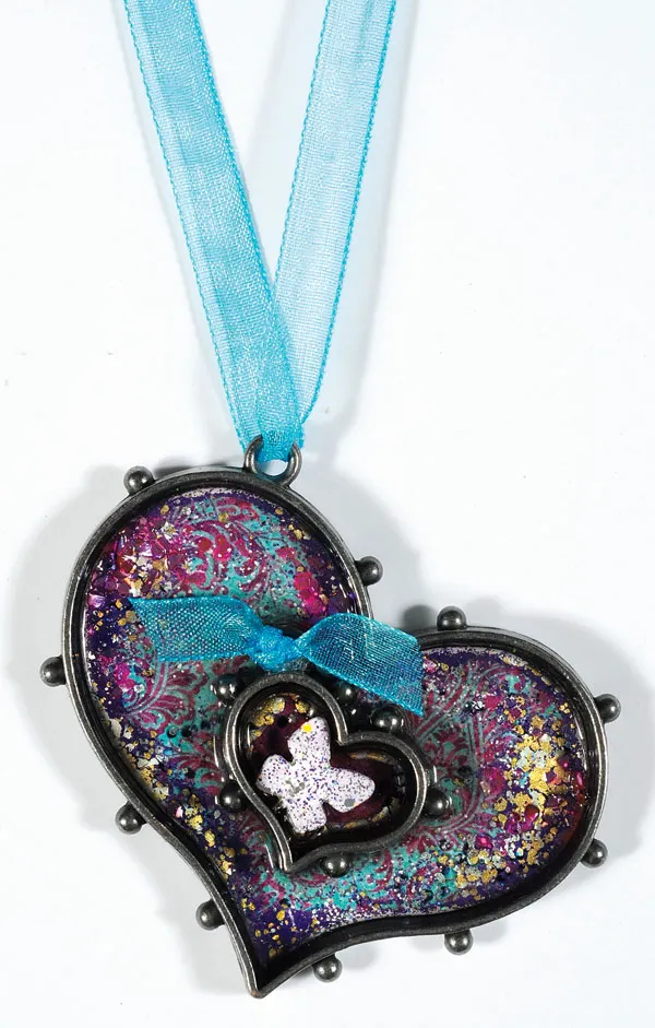 Ink the butterfly portion of the trinket pin with VersaMark™ ink. Sprinkle with Vintage Lilac Embossing Tinsel and emboss. Use the wire cutters to trim the pin from the butterfly. Place the butterfly angled inside the small heart bezel on top of the 3-D Lacquer. Allow pieces to dry overnight. Glue or Zot™ knotted 1/4" wide aqua sheer ribbon to the loop on the small bezel. Thread aqua sheer ribbon through the loop at the top of the large heart bezel and tie for wearing.