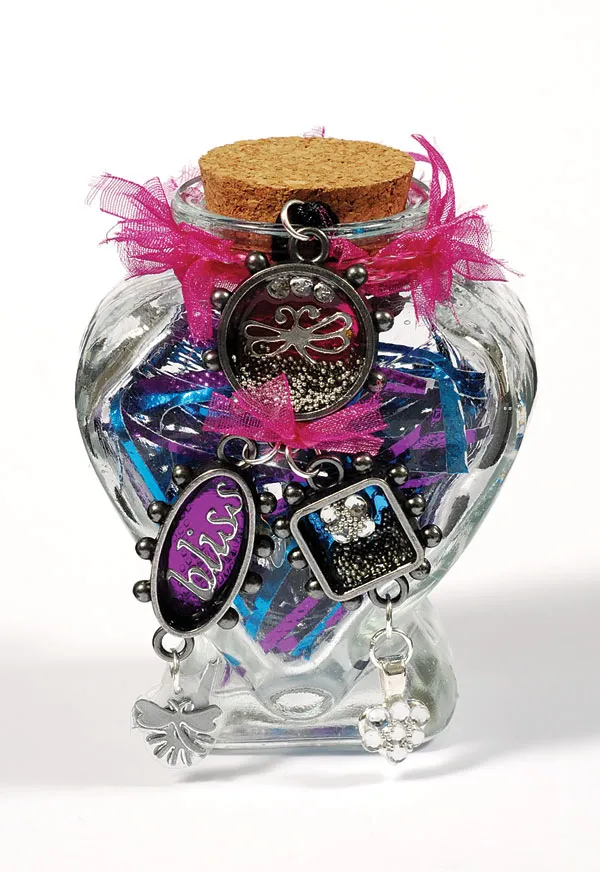 Fill the jar with 1/16” wide strips of foil paper and wrap a length of Grapefruit pink bows ribbon around the jar neck. Tuck the satin cord inside the jar, allowing the charms to dangle in front and top with the cork.