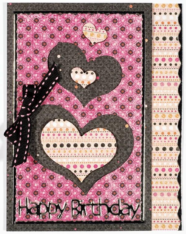Place “Happy Birthday” Dazzles™ at the bottom of the pink paper. Use 3/8” wide Grapefruit black/pink stitch ribbon to make a bow and Zot to the top left on the largest heart cut away.