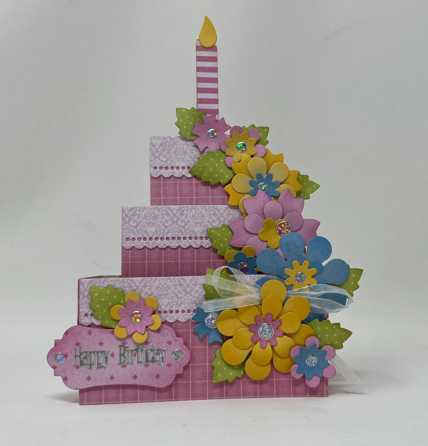 1. For the card: Follow the die package directions to create the cake box card, using Sweet Pea pink plaid cardstock for the cake, white lace cardstock for the frosting pieces, and striped cardstock for the candle. Use Teacups & Roses yellow solid cardstock for the candle flame.