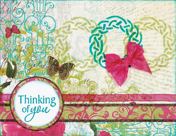 Punch a 1 1/4” circle from white cardstock and ink the edges with a cosmetic sponge using Deep Lagoon. Stamp “Thinking of You” in the center. Mat on pink/green medallion, leaving a 1/8” border. Mat this on brown texture, leaving a 1/16” border. Glue to bottom left of card, 1/4” from the bottom and 1/2” from the left.