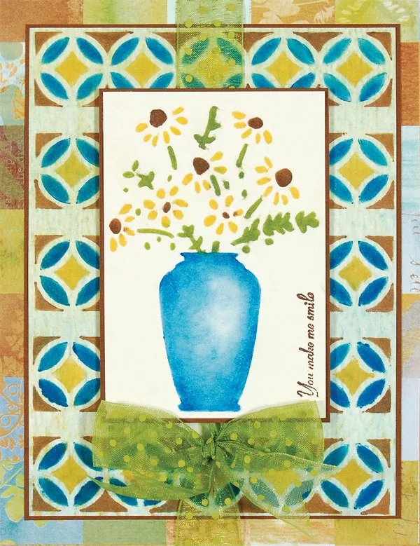 Chalk the flower stencil on a 2 5/8”x3 7/8” ivory cardstock. Mat on brown cardstock with 1/16” borders. Stamp “You make me smile.” with brown ink as shown. Foam tape centered on the card.
