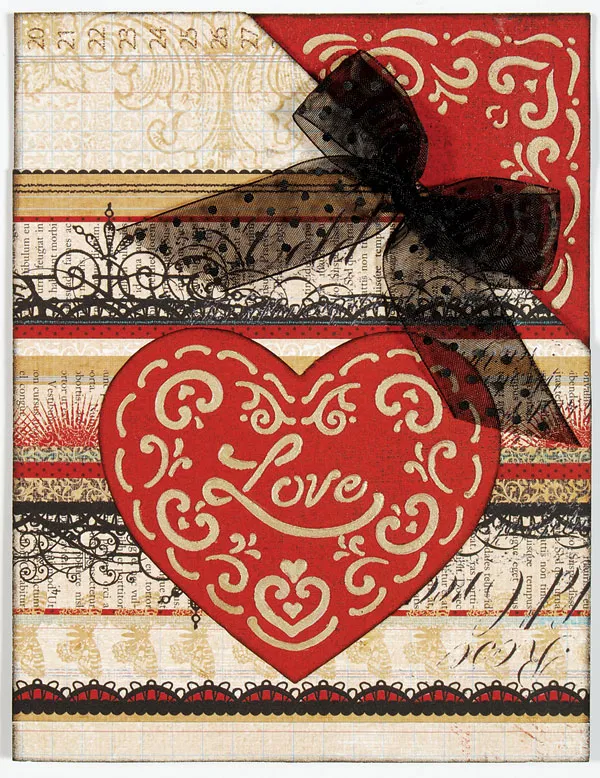 Place the love/heart stencil on red textured paper. Use the stencil tape to secure it to the paper. Use the squeegee to apply the Artist Spackle™ over the stencil. Spread the spackle evenly, filling in the open areas of the stencil. Use the squeegee to add the excess spackle back into the container. Carefully remove the stencil from the paper. Rinse the stencil and squeegee with water and pat dry with a paper towel. Repeat this procedure for two corner stencil images, both centered on a corner of the red textured paper. Let all three images dry.