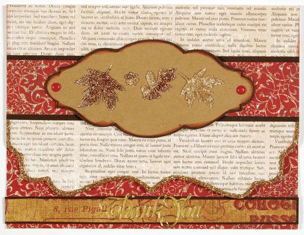 Inside: Glue a 6 1/2” x 2 1/2” piece of red vine paper to the bottom edge of the card inside back. Mat a 6 1/2” x 1/2” strip of tan/red print paper with brown cardstock, leaving a 1/16” border. Glue 1/8” from the bottom edge. Close the card and center the Dazzles Greeting “Thank You” to the center of the border.