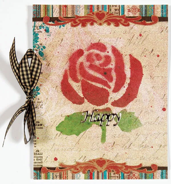 Place the card fold on the side. Cover the card with striped paper. Cut a 5” x 5 3/8” piece of paper from the ivory border paper. Place the rose stencil at the center of the paper and mask off area around edge of stencil and the stem and leaves. Mist the rose blossom with Red Velvet Glimmer Mist.