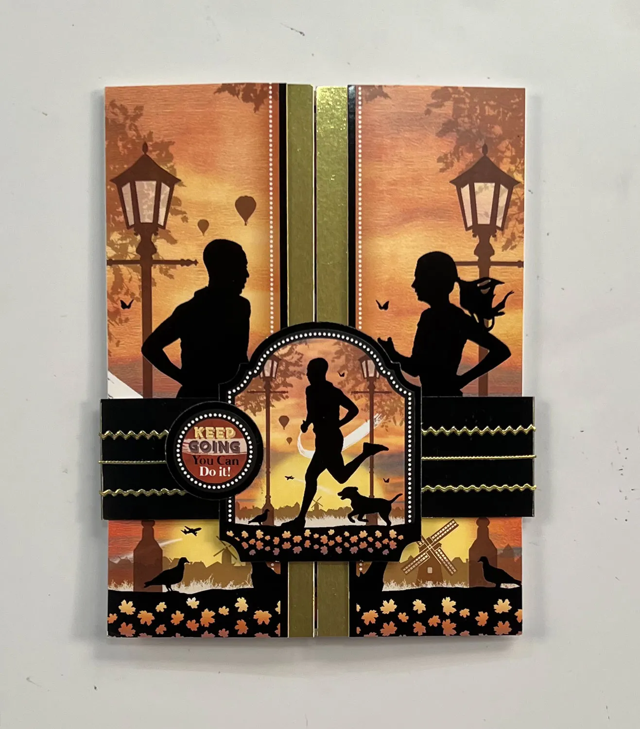 Belly Band- Cut 1 ½”x11 ½” Black Mirri. Fold loosely around the card and glue overlapping at the back. Place Thin Line Dazzles™ on the front. Foam tape the small runner topper to the center and glue the "Keep Going You can Do it" small Topper as shown.