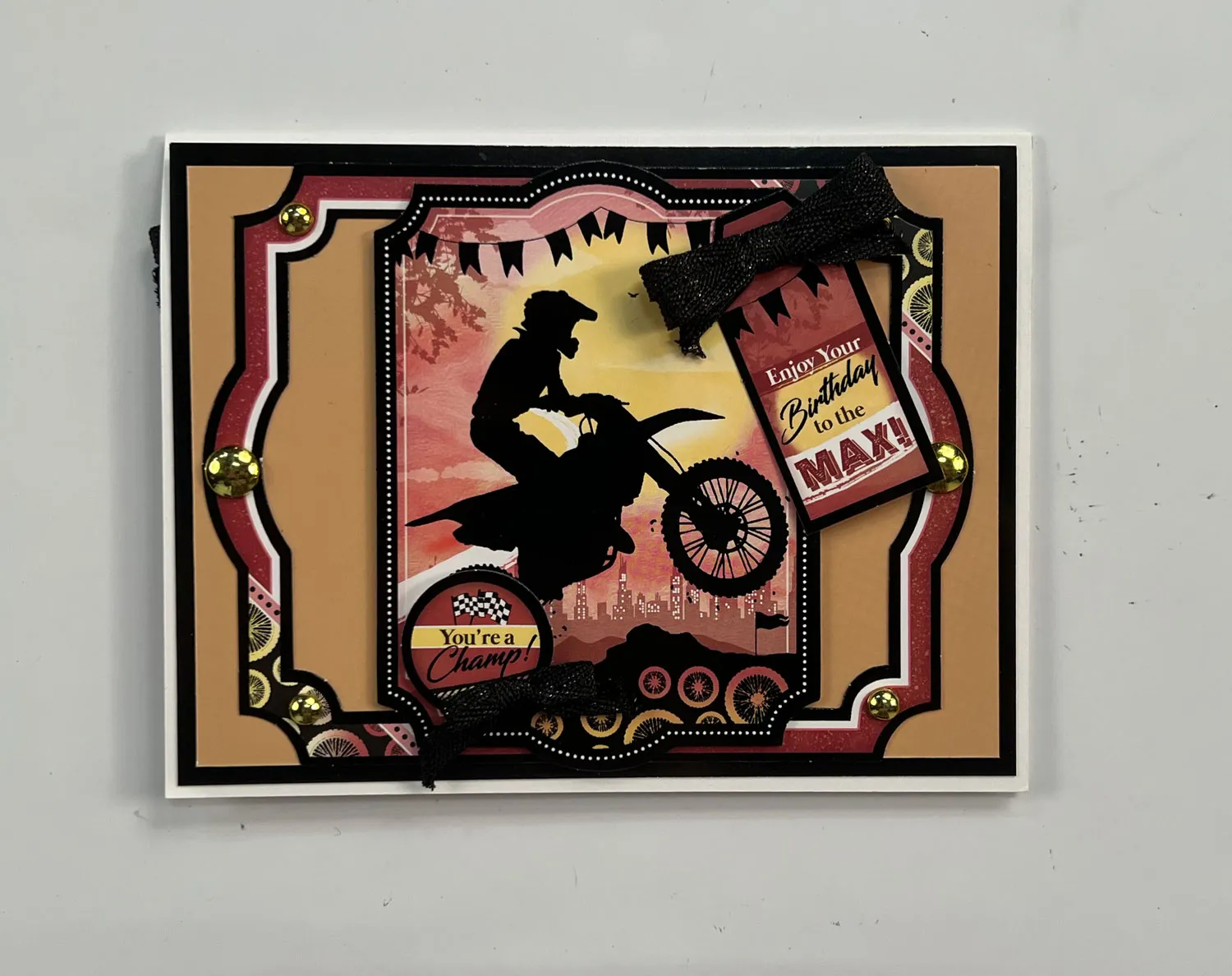 Mat 6”x4 ½” tan Adorable Scorable on Midnight Black Mirri with 1/8” borders. Glue to the card front leaving a 1/8" white border. Select the large dirt bike Topper from the "Born to Ride" sheet and remove the inner frame for the card inside. Glue the outer frame horizontally and foam tape the center piece vertically in the card center. Glue the "Enjoy Your Birthday” Topper to dirt bike image and foam tape "Your a Champ" to bottom left. Zot™️ a 1 ½" wide black bow to top and a 1" wide black bow as shown. Place gold studs on the outer frame as shown.