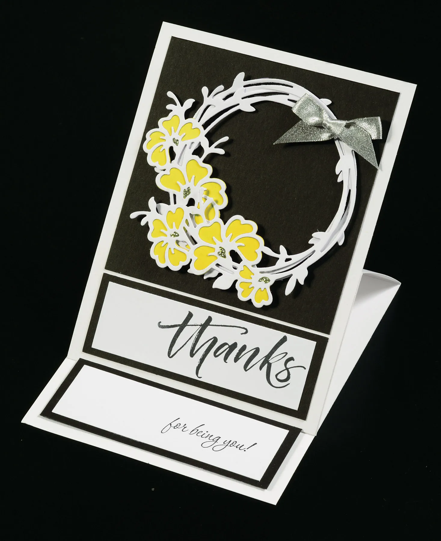 Card front: Glue a 4 ½” square of black cardstock ¼” from the top and sides of your card front. Die-cut two wreaths from white cardstock. Use a wedge to ink white cardstock with Sqeezed Lemonade distress ink, then die-cut two sets of the backing flowers. Glue the yellow backing flowers onto the backs of the matching flowers of the wreaths. Cut through one wreath just above the flowers, place over the other wreath, staggering the flowers, and wrap the top cut wreath around to the back of the other wreath. Glue in place, then foam tape the double wreath centered on the black cardstock. Add stickles to the flower centers and let dry. Zot™ on a bow of silver ribbon.