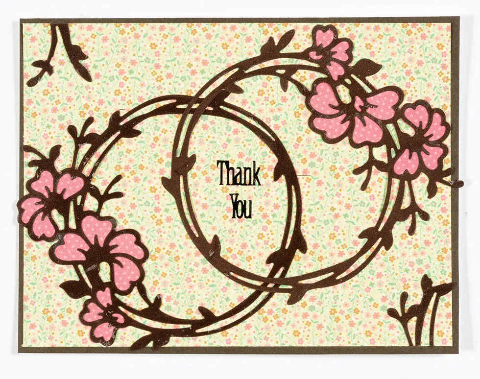 Die cut two wreaths from Moka Suede paper. Die cut two sets of flower backs from Emma’s Garden pink dot paper. Glue the flower backs onto the flowers. Glue one wreath with the flowers on the bottom left corner. Glue the second one with the flowers on the top right corner.
