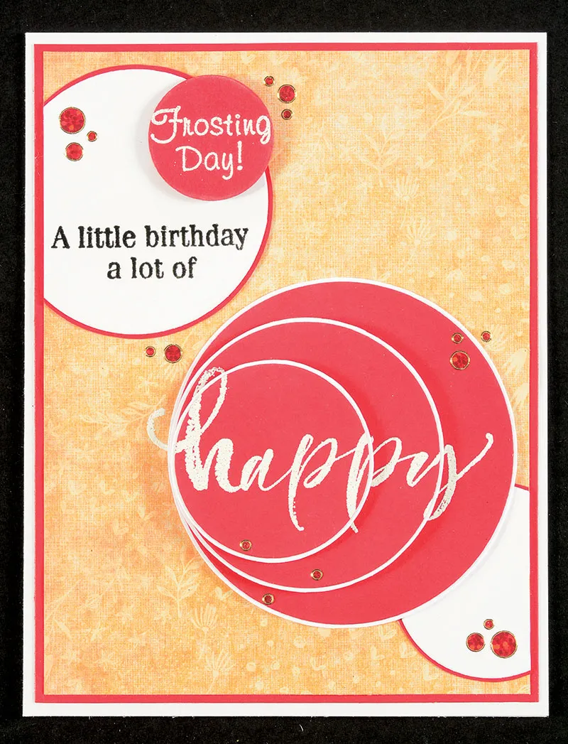 Mat the paper on red cardstock with a 1/16” border and glue centered on your card. Glue the large red circle of “Happy” onto your card, as shown and foam tape the rest of the circles in place, lining up the edges of the stamped word. Stamp and emboss “Frosting Day! Onto a small red circle and foam tape in place. Add Jewel Dazzles™.