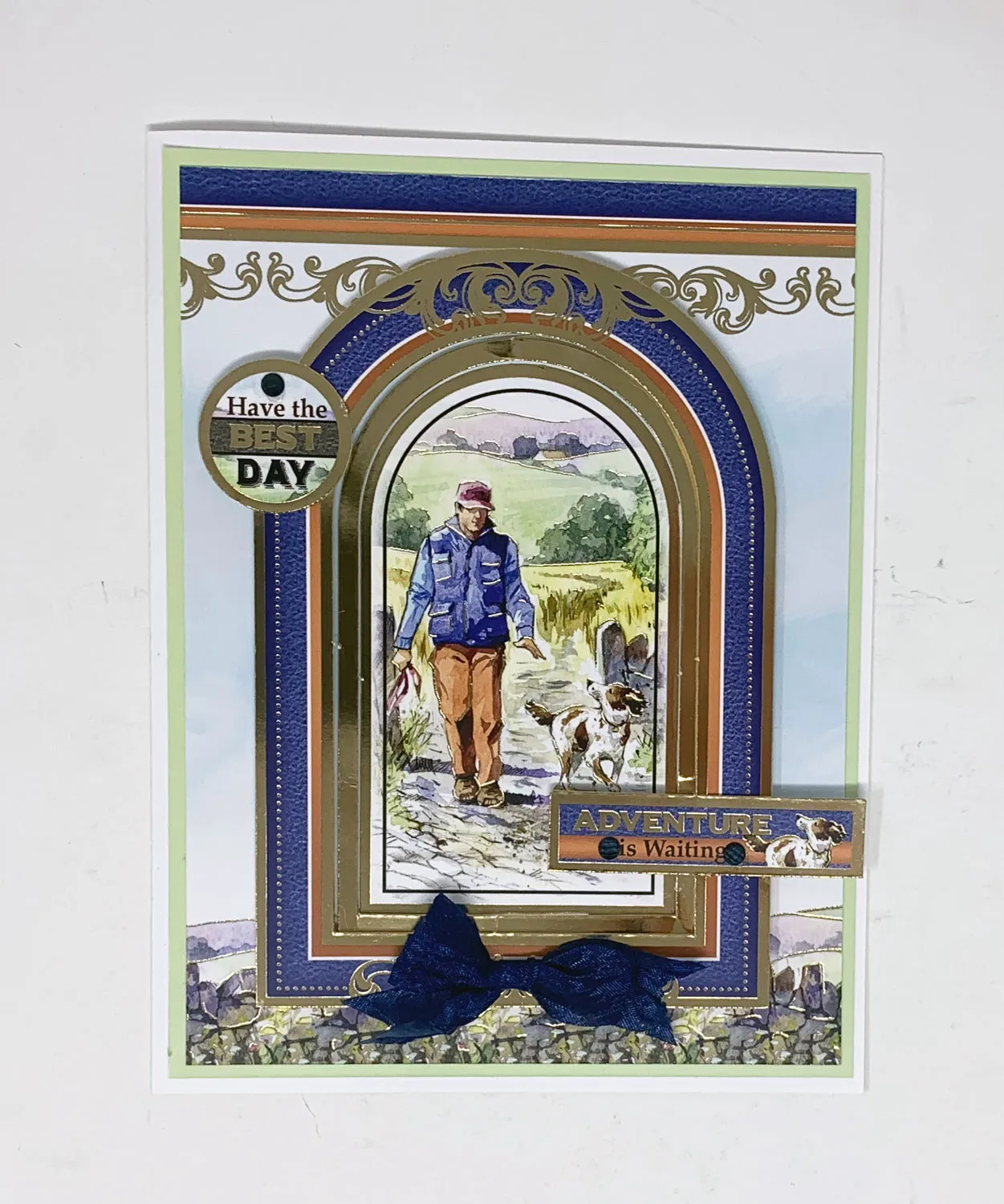 Cut 4 ½”x6” dog walking Adorable Scorable. Mat on light green Adorable Scorable leaving a 1/16” green border. Glue to the card leaving a 1/16” white border. Separate all three pieces of the dog walking Topper. Glue the inner image to the card. Add one layer of foam tape to the middle frame and place outside the first image. Add a double layer of foam tape to the outer frame and attach for a telescopic effect. Glue “Have the Best Day” topper to the left side of outer frame. Glue the “Adventure is Waiting” to the lower right. Zot™ 1 1/2” wide blue bow to the bottom and place the Diamond Sparkles as shown.