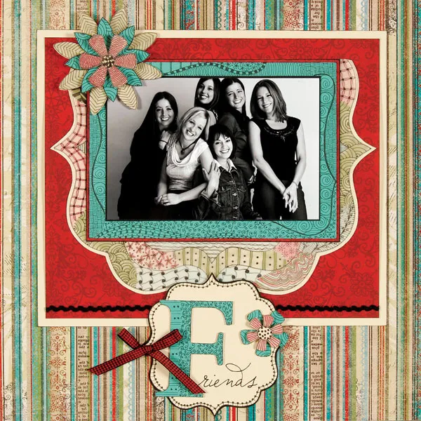 Cover the “F” monogram with teal cardstock, then ink the edges. Draw a line to divide the letter into 2 sections with the pencil, then draw tangles inside each sections. Use the black pen to trace a 4” scallop on ivory cardstock, then cut it out. Write or computer print “riends” on the bottom to the right of where the first letter “F” will be placed. Mat on black leaving a thin border. Use the black pen to draw a tangle border around the edge, following the scallop shape. Glue the monogram to the left of the rest of the word. Glue to the page as shown.