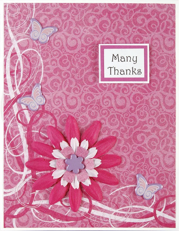 Print “Many Thanks” in black on white and trim it to 3/4"x1 1/8”. Mat it on dark pink, then on white. Add foam tape to the back, then adhere it to the upper right as shown. Glue the constructed piece centered on the blank card front.