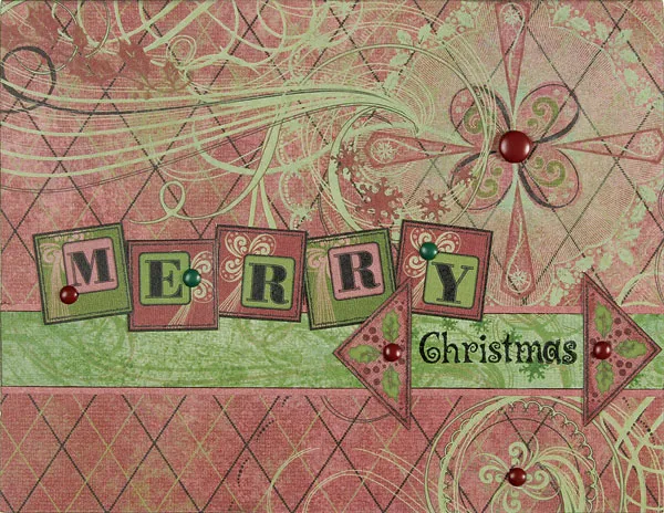 Cut out the tiles to spell “merry.” Position the letters across the upper edge of the green strip and glue in place. Cut out the holly corners and glue one on each side of “Christmas.” Add one regular brad and the mini brads to the tiles, corners and background as shown. Glue the constructed piece to the blank card front.