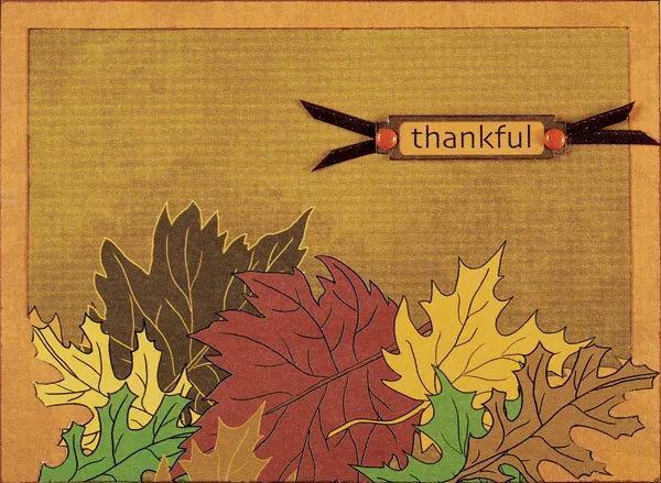 Cut a piece of the painted leaves paper to 6”x4 3/8&rdquo,; measuring from the lower left corner of the paper. Carefully cut ¼” off the right side, stopping just above the brown leaf. Cut around the right end and lower edge of that brown leaf. Cut around the green and yellow leaves on the lower left side. Ink the straight edges. Glue this piece to the orange shadowed leaves, aligning the bottom edges. Glue the constructed piece to the blank card front.