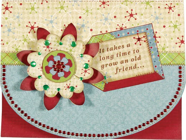 Outside flower: Cut out the outside flower shapes. When cutting the coned shaped flower, cut one side of the tab and cut out the inner circle at the flower center. Fold tab behind the flower and glue in place to achieve the “cone” shape. Glue the cone flower to the large red flower. Foam tape the flower center over the cut out center of the cone flower. (tip: the foam tape will help to keep the cone flower secured to the bottom red flower.) Glue the outside greeting tag extending from under the flower.