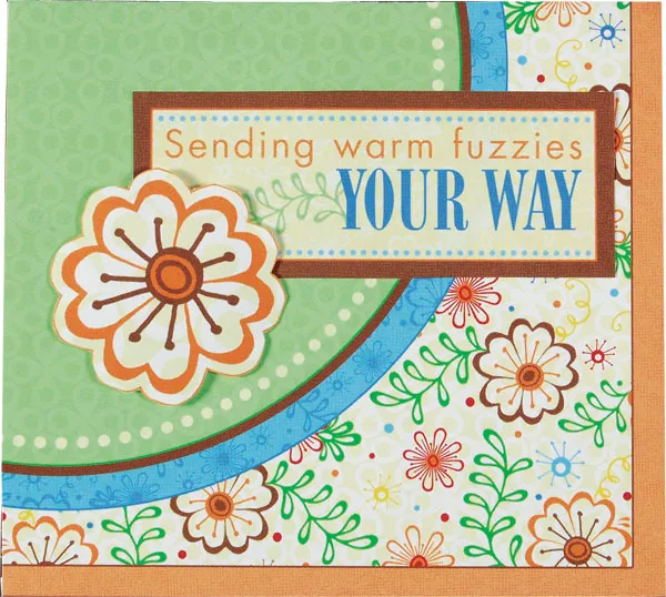 Place your card fold at the top. Glue the square cut-out cover paper with the circle in the top left corner. Trim away excess card. Glue the “Warm Fuzzies” greeting as shown and foam tape the flower at the lower left corner.
