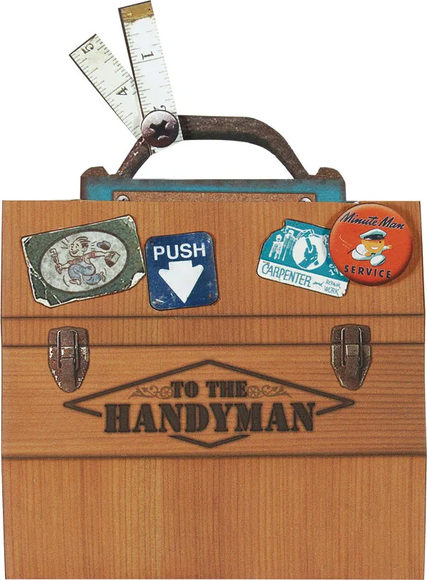Glue the bottom tabs together on the inside of the tool box, with the bottom of the tag sandwiched between. Glue and foam tape the art work to the top of the box. Pull the tag while pushing the box down to form the rectangular tool box shape.