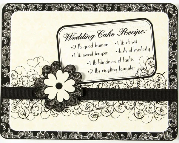Place the card fold at the top. Cover the card front with the black border paper and trim. Glue the “Wedding Cake Recipe” at the top at an angle. Glue the black paper ribbon over the border and top with a foam taped flower.