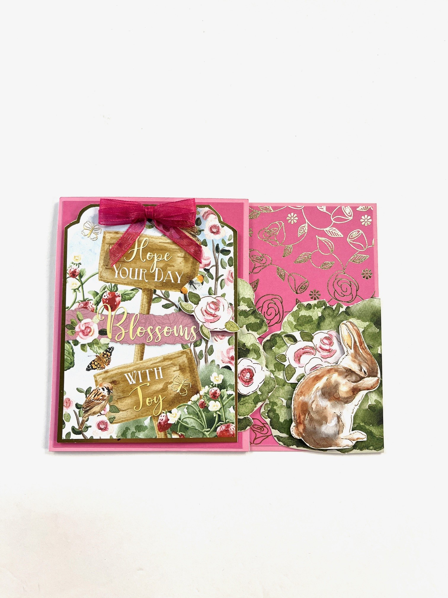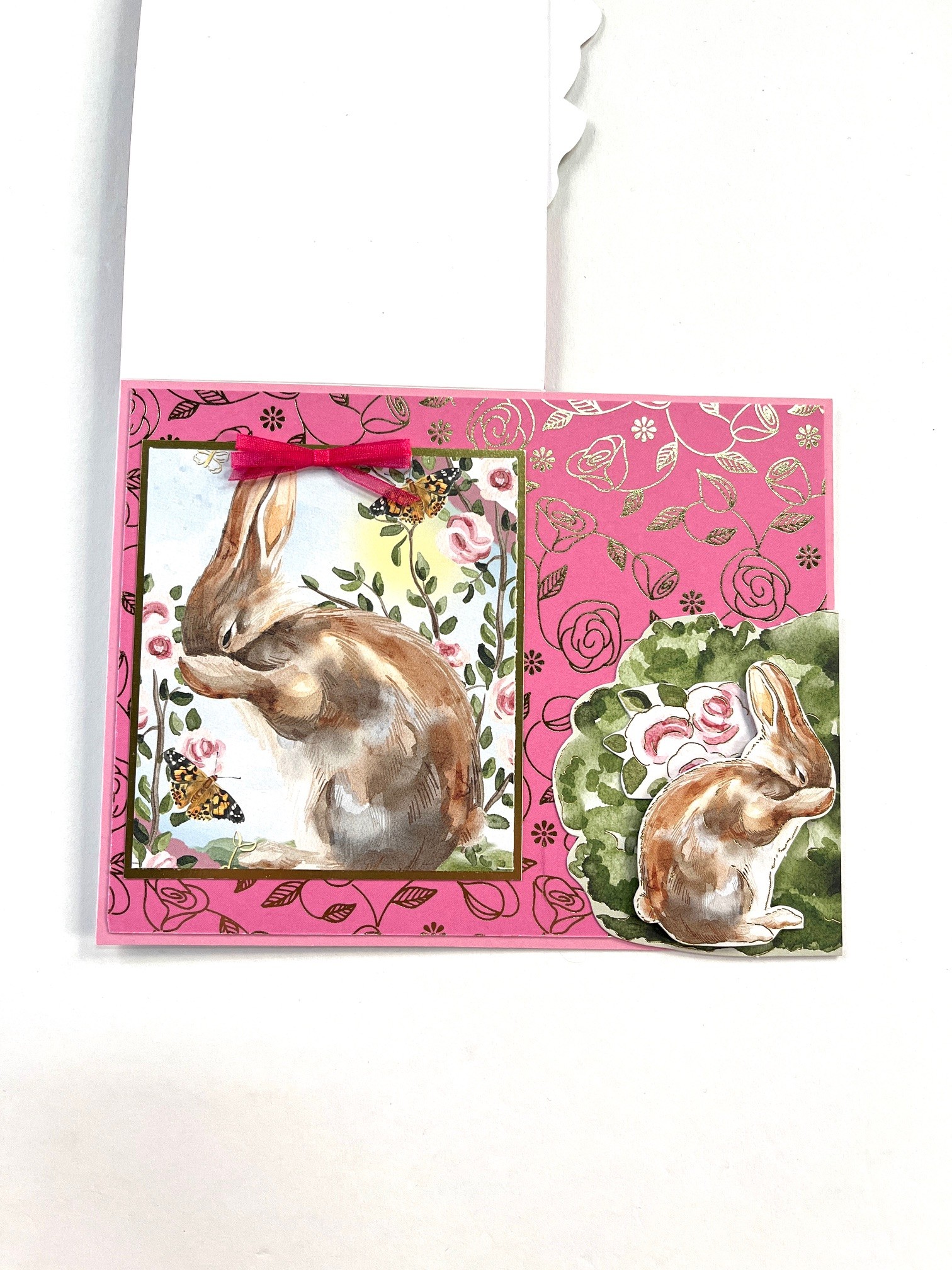 Card inside: Cover card base with tape, place light pink Tulips and Butterflies 12x12 solid cardstock on top flush to fold and one side; trim off the excess. Cut a 6 1/2”x4 3/4” pink Foiled Edge-to-Edge Cardstock and tape to the light pink cardstock leaving a 1/16 pink cardstock border. Tape the Topper Elements bush in the bottom right corner and trim off right side as shown. Foam tape the rabbit and glue the flowers on the bush as shown. Trim the rabbit tag to 3 1/4”x3 5/8” and mat on gold metallic cardstock leaving 1/16 gold borders. Tape under the front flap 1/2” from top and bottom and 1/4” from the left side. Make and Zot™️ a 1 1/2” pink Bow from the Magenta & Dark Pink Ribbon set and place at the top.