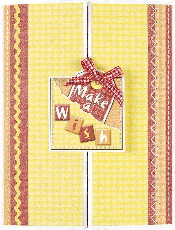Cut out the “make a wish” art and mat it on white cardstock. Glue it to the center of the left flap only to extend over the right flap when the card is closed. Use 6” of ribbon to tie a bow, trim the ends, and glue it to the tag area of the art.